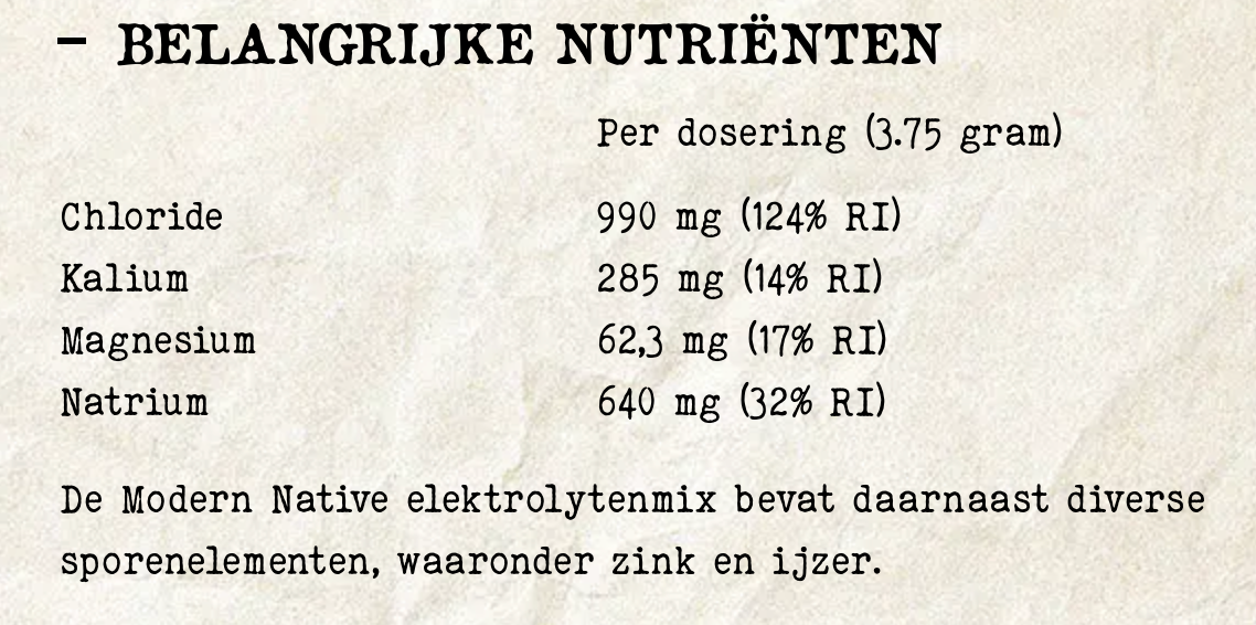 Ons pure elektrolytenpoeder bestaat uit volledig natuurlijke, ongeraffineerde ingrediënten en bevat naast magnesium, chloride, natrium en kalium een breed spectrum aan sporenelementen, zonder enige toevoegingen. De elektrolyten uit deze mix zijn afkomstig uit Keltisch zeezout, wijnsteen en mineralen uit zeewater, zonder enige toevoeging zoals smaakstoffen of zoetstoffen. Doordat deze elektrolyten van nature voorkomen in zoutverbindingen heeft onze elektrolytenmix een ziltige smaak.