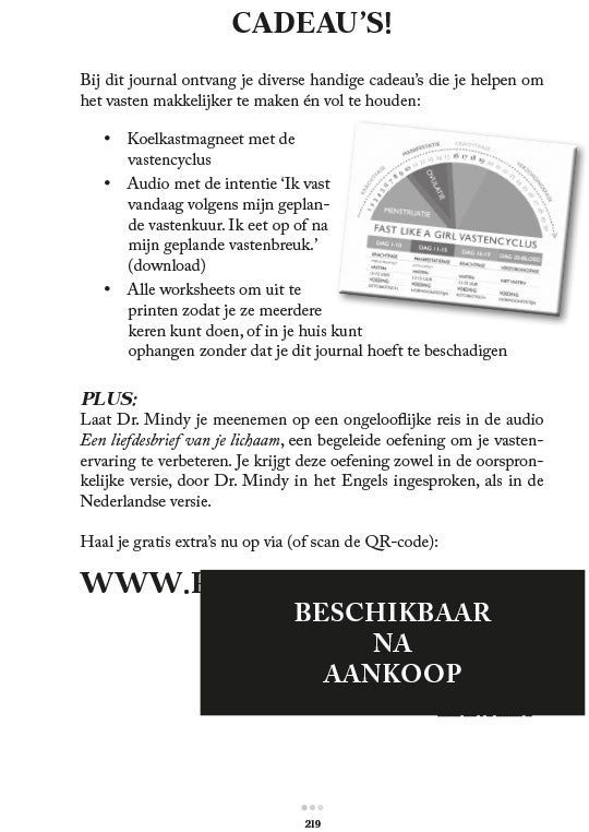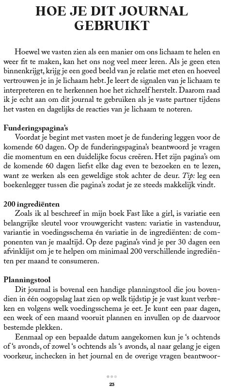 Het Fast like a girl journal is ontwikkeld als begeleiding bij de bestseller Fast like a girl om jou praktisch en emotioneel te ondersteunen bij je vastentraject. Het is de perfecte manier om de vastencyclus te plannen én bij te houden. Door het noteren van verschillende gegevens zoals je cyclus, slaap, energie en stemming leer je hoe je lichaam reageert op bepaalde voeding en vastenduren tijdens de verschillende fasen in je cyclus. Die informatie helpt je: bijvoorbeeld welke voeding je moet vermijden.
