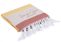 Een stijlvolle en mooie hamamdoek, ontworpen in samenwerking met ontwerpster Marieke van Heck, in een unieke compositie van geel, baksteen en beige.