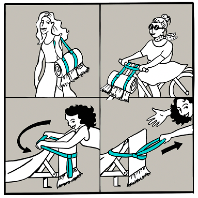 Deze multifunctionele handdoek strap kun je bovendien gebruiken om je handdoek aan je ligbed te bevestigen, zodat 'ie niet wegwaait.