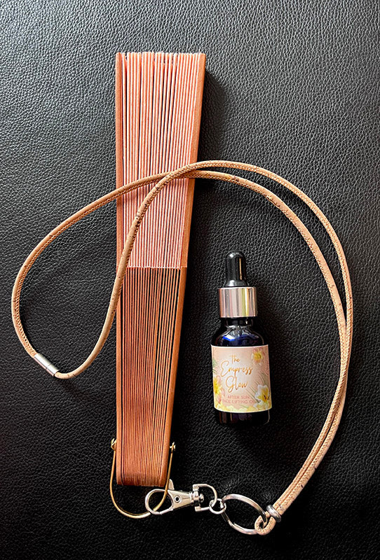 Deze set bestaat uit een handgemaakte waaier en een flesje after sun olie