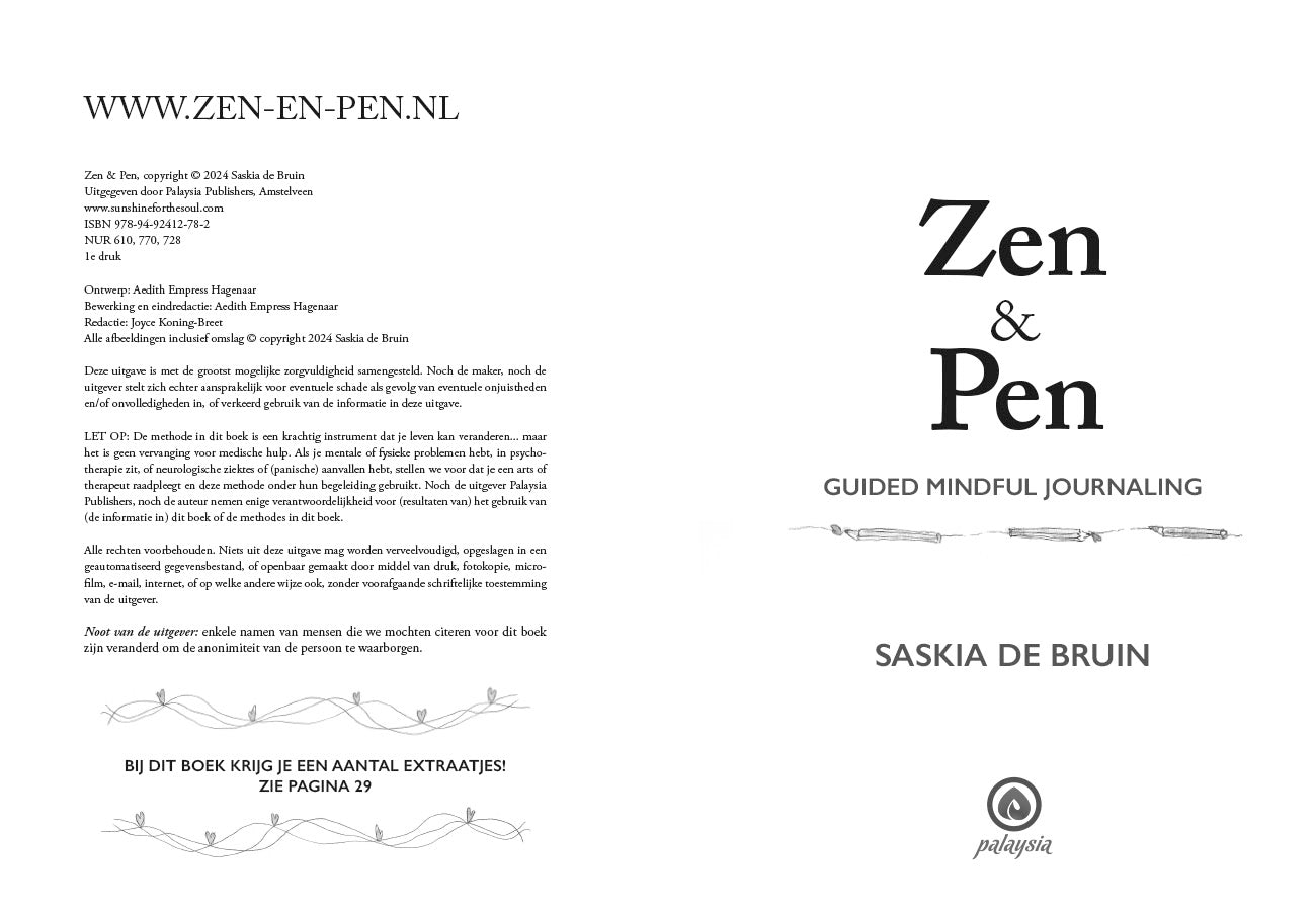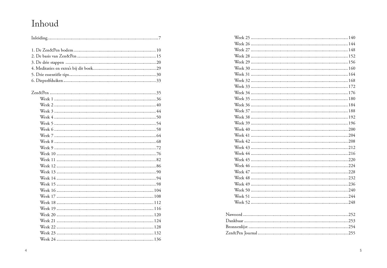 "Zen & pen, Een inzichtelijke gids met schrijf- en meditatie-opdrachten om mindfulness te oefenen. De auteur beschrijft haar methode Zen & Pen als een weg die de beoefenaar brengt bij zijn of haar diepste zelf. Het boek bevat voor elke week van het jaar vijf oefeningen, met als doel om door middel van journaling een pad van ontdekking, bevrijding, heling en groei te bewandelen. Het boek wordt geleverd met een code voor twee gesproken meditaties, vakantie-zen en een ansichtkaartenset. Persoonlijk getint en zeer toegankelijk geschreven, vanuit licht spiritueel perspectief. Met enkele herhalende kleine zwart-wit illustraties."